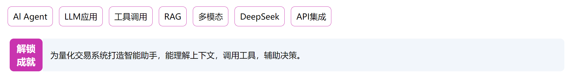 程序员AI量化理财体系课,股票、债券、基金、量化交易、券商——系统构建金融核心知识体系,筑牢量化投研的理论地基。从0到1搭建Python量化框架库,完整走通量化系统的全栈开发全流程,让策略从想法到上线,一路自动执行。从0到1掌握AI Agent开发、LLM大模型、Prompt工程等前沿技术,真正实现让AI理解需求、响应指令、替你决策。